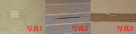 ★バーチベニヤには補修のパッチがある場合があります(写真1)。バーチベニヤの木口には節に当たる部分が焦げていたり、一部抜けていることがあります。(写真2)また木目方向に毛羽立ってしまう感じになる場合があります。(写真3)